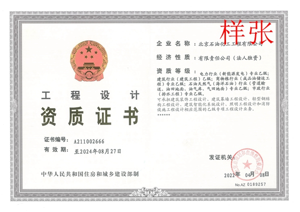 電力行業(yè)(新能源發(fā)電)專(zhuān)業(yè)乙級(jí);建筑行業(yè)(建筑工程)乙級(jí);商務(wù)糧行業(yè)(成品油儲(chǔ)運(yùn)工程)專(zhuān)業(yè)乙級(jí);石油天然氣(海洋石油)行業(yè)(管道輸送、油田地面、油氣庫(kù))專(zhuān)業(yè)乙級(jí);市政行業(yè)(排水工程)專(zhuān)業(yè)乙級(jí)。