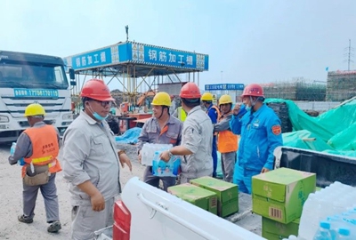 澆筑期間,正值高溫天氣,項(xiàng)目組采購(gòu)了飲料、礦泉水等防暑降溫慰問(wèn)飲品,為堅(jiān)守一線的工人送去絲絲涼意,感謝他們的堅(jiān)守與付出。