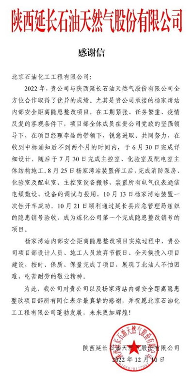 近日,北京石油化工工程有限公司收到來自陜西延長石油天然氣股份有限公司的感謝信,對我公司總承包的楊家灣站內部安全距離隱患整改項目在建設期間精心策劃、合理安排施工、克服不利因素,保質保量按期完成了任務目標,得到了業主的肯定。