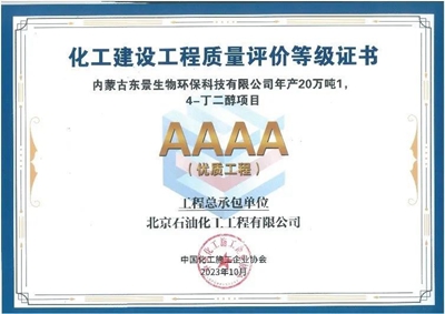 近日,中國(guó)化工施工企業(yè)協(xié)會(huì)公布2023年化工建設(shè)工程質(zhì)量評(píng)價(jià)結(jié)果,北京石油化工工程有限公司總承包的“內(nèi)蒙古東景生物環(huán)保科技有限公司年產(chǎn)20萬(wàn)噸1,4丁二醇(BDO)項(xiàng)目”榮獲化工建設(shè)工程質(zhì)量評(píng)價(jià)4A級(jí)(優(yōu)質(zhì)工程)。